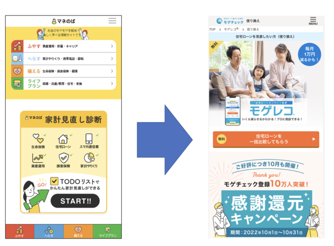 「マネのば」サイト内の家計の固定費見直し診断の項目のうち、住宅ローンの見直しを検討しているユーザーに対し住宅ローン比較サービス「モゲチェック」の借り換えサービスサイトに遷移できる導線を「マネのば」内に設置します。この取り組みによって、住宅ローン返済中のユーザーは、家計の中で最大の固定費である住宅ローンの見直しをスムーズに行うことができます。