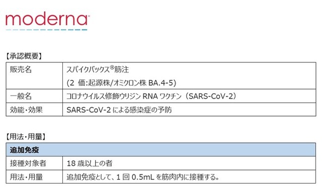メッセンジャーRNA(mRNA)治療薬とワクチンのパイオニアであるバイオテクノロジー企業 Moderna Inc.(以下、「モデルナ」)の日本法人モデルナ・ジャパン株式会社(東京都港区、代表取締役社長:鈴木蘭美、以下、「モデルナ・ジャパン」)は、本日、オミクロン株BA.4-5に対応した追加接種用2 価ワクチン「スパイクバックス(R)筋注」(2価:起源株/オミクロン株BA.4-5)の医薬品製造販売承認事項一部変更承認を取得しましたので、お知らせいたします。「スパイクバックス(R)筋注」(2 価:起源株/オミクロン株BA.4-5)は、18歳以上を対象としており、mRNA-1273の起源株とオミクロン株BA.4-5に対応するmRNAをそれぞれ25μg含む、次世代の追加接種用2価ワクチンです。