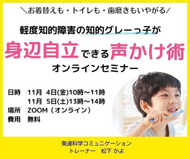 この度は、11月4日、5日に、着替えも・トイレも・歯磨きもいやがる軽度知的障害のお子様が身辺自立できるママの声かけ術をお伝えするセミナーをオンラインで開催します。