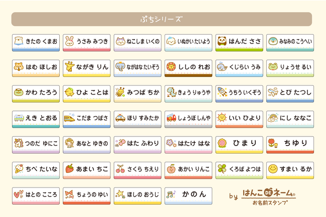 オリジナルブランド「はんこDEネーム」で人気の「ぷちシリーズ」。40デザインの中から特に人気のイラストを厳選しました。すべて当店のイラストレーターが作成したオリジナル。今では、お名前シールや印鑑にも展開されてている人気シリーズです。