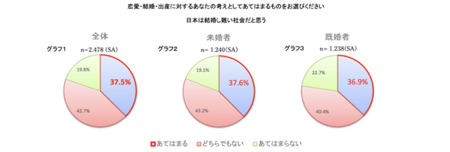 未婚晩婚化が進行する中、20代の男女に結婚に対する考え方を調査しました。「日本は結婚し難い社会だと思う」か聞いたところ、全体(以下、最大n数2,478名)のうち、37.5%の方が『あてはまる(「とてもあてはまる」含む)』と回答しました。〈グラフ1〉このように回答した人の割合は未婚者(37.6%)〈グラフ2〉と既婚者(36.9%)〈グラフ3〉で大きな差はなく、多くの20代が現在の日本は結婚し難いと考えていることが分かりました。