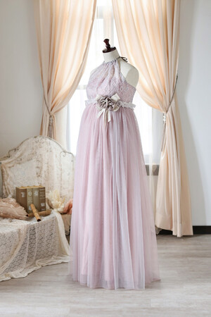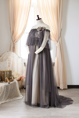 秋の新作ドレスは、優しく、ふんわりとした印象が特徴。生まれる前の赤ちゃんをお腹に抱いた神秘的な姿をロマンティックに演出します。たとえば、ハイウェストのマタニティドレスは、柔らかいニュアンスカラーのチュールが印象的。ウエストには花のリボンを添えて可憐さをプラスしています。丸いお腹が見えるチューブトップにはレースがあしらわれ、華やかなムードを演出しています。また、セットのチュールを羽織れば露出度を抑えてエレガントな装いに。好みに合わせてハイウェストドレス、セパレート、チュールの組み合わせで、6WAYのスタイルを楽しめます。