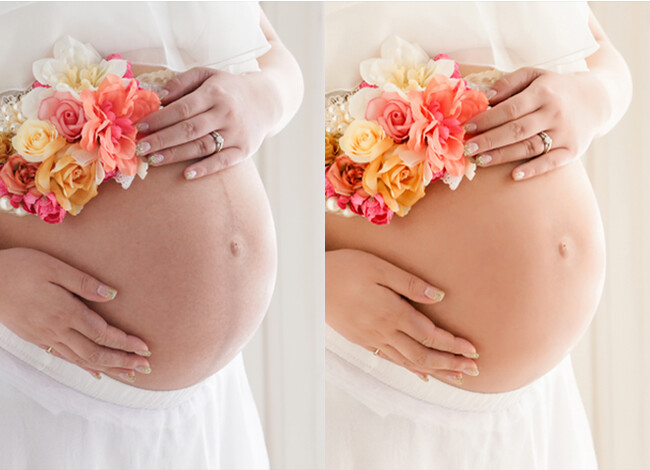 照明をはじめ写真の明るさや色味をプロの技術で修整し、妊娠線や正中線、産毛など気になる部分も目立たず、ふんわりと滑らかな肌質に仕上げます。