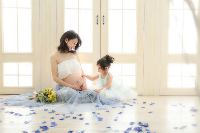 ご家族での撮影は追加料金がありません。赤ちゃんのご兄弟・姉妹も好きな衣裳をレンタルして、お腹にいる赤ちゃんと初めての家族写真を楽しめます。