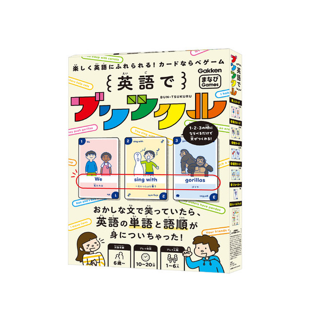 おかしな文で笑っていたら、英語の単語と語順が身についてしまう「ブンツクル」。親子、きょうだい、友達どうしなどで、楽しく英語で遊べます。英語に苦手意識がある大人の方にもおすすめです。楽しみながら英語に親しんでもらえるとうれしいです。