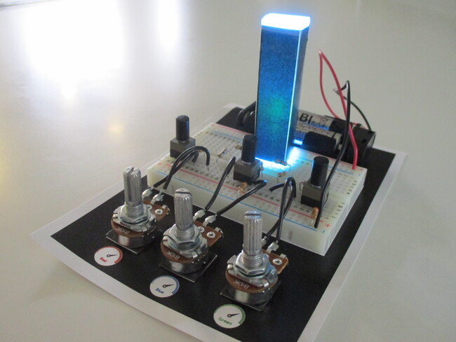 光の三原色のLEDを使って、様々な色の光を作ることができる装置を作ります。