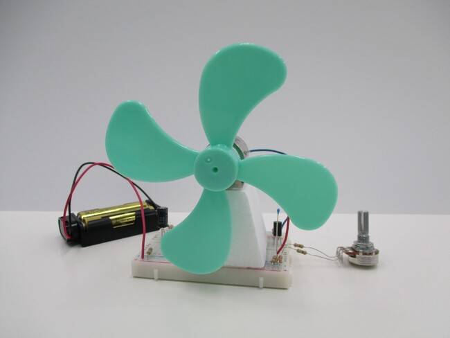 モーターとプロペラを使って扇風機を作ります。『抵抗』をうまく使って風の強さを変えてみましょう!