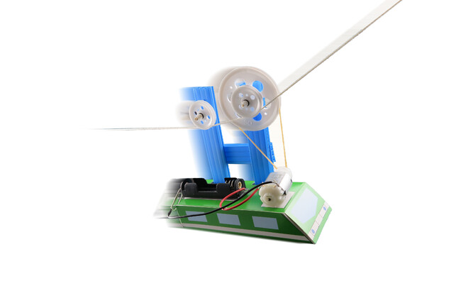モーターと滑車を使ったロープウェイを空中で走らせて、速さと走る力強さの関係を学習しましょう。