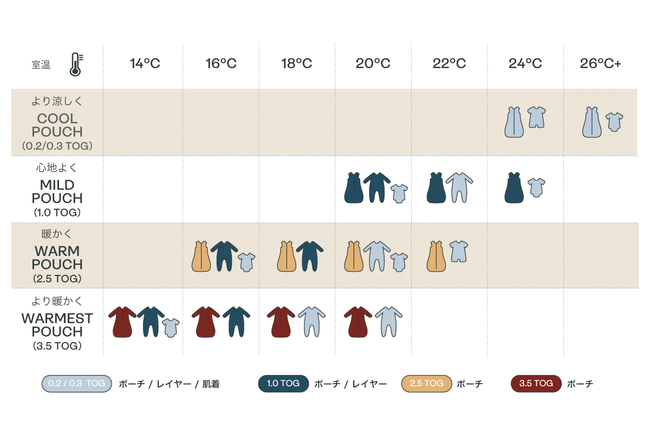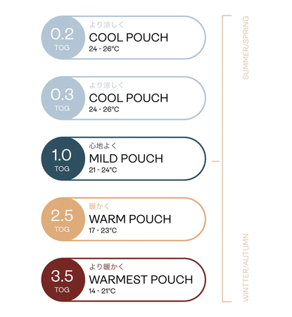 エルゴポーチのアイテムは、暖かさを表すTOG(トグ)規格を取得しています。TOGとは「Thermal Overall Grade」の略で、寝具用品の断熱性・保温性を表す単位です。簡単に言うと、TOGが低いほど生地が軽く、高いほど中綿や保温性が高いということです。お子さまの睡眠環境の室温に適したTOGを選ぶとよいでしょう。