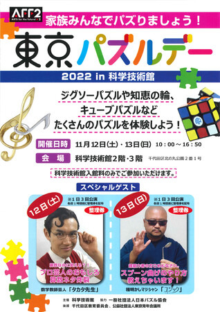 科学技術館は、ジグソーパズルや知恵の輪、キューブパズルなどたくさんのパズルを体験できる「東京パズルデー 2022 in 科学技術館」を11月12日(土)~13日(日)に開催します。たくさんのパズルメーカーが出展し、遊び方や解き方のコツを教えてくれます。スペシャルゲストとして12日(土)は数学教師芸人「タカタ先生」による算数なのに笑える“算数ショー”。13日(日)は種明かしマジシャン「ユジック」による「スプーン曲げのやり方教えちゃいます!」が登場。また、両日ともルービックキューブ日本チャンピオンによる凄ワザをご覧いただけます。