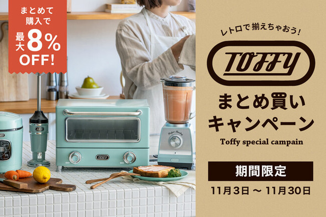 キャンペーン期間中は、Toffy(トフィー)の商品2点の購入で5%OFF、3点以上の購入で8%OFFにてお買い求めいただけます。
