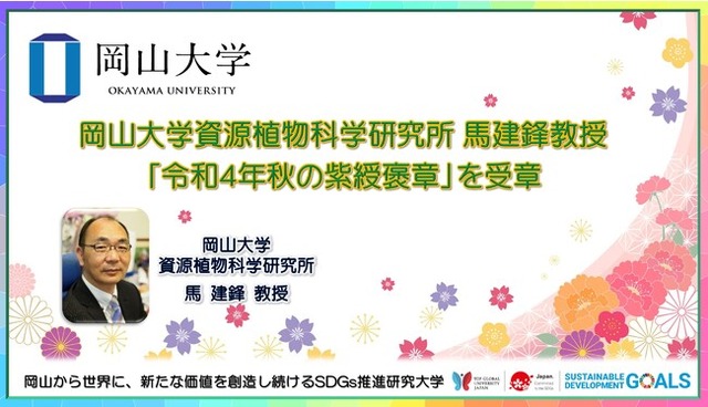 国立大学法人岡山大学(本部:岡山市北区津島中、学長:槇野博史)資源植物科学研究所の馬建鋒教授が、令和4年秋の紫綬褒章を受章しました。紫綬褒章は、科学技術分野における発明・発見や、学術及びスポーツ・芸術文化分野における優れた業績を挙げた方に贈られる国家褒章です。