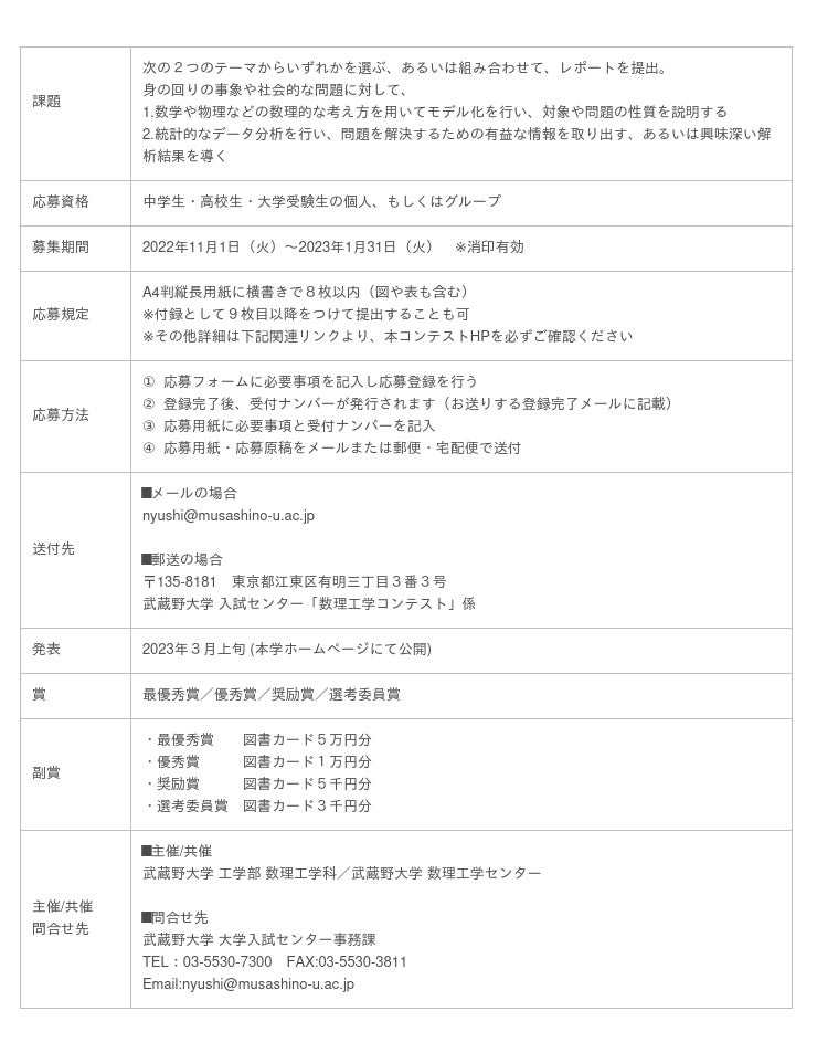 ■「第9回 数理工学コンテスト」HP:https://www.musashino-u.ac.jp/academics/faculty/engineering/mathematical_engineering/mathematical_engineering_contest.html