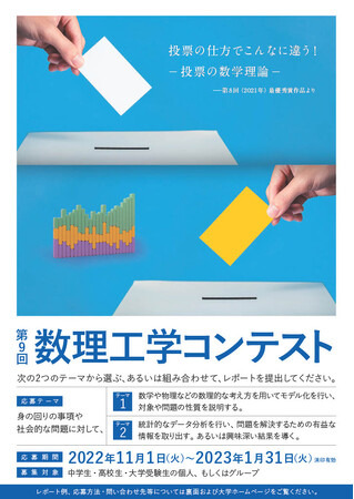 武蔵野大学工学部数理工学科(東京都江東区)は、次代を担う中学生・高校生・大学受験生を対象にした「第9回 数理工学コンテスト」の作品を2022年11月1日(火)~2023年1月31日(火)の期間で募集します。