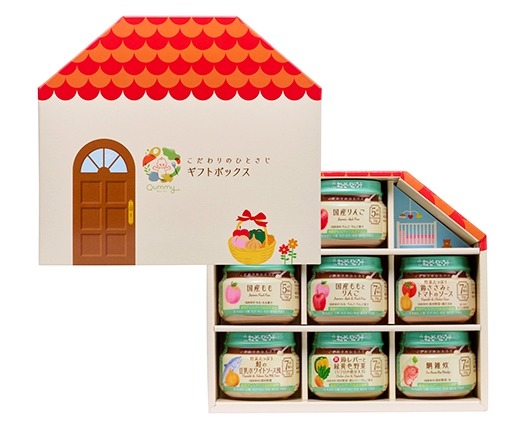 産地・具材感・栄養によりこだわった低月齢向けの瓶詰ベビーフード「こだわりのひとさじ」シリーズ全7品がセットになったギフトボックスです。家の形にデザインされたかわいらしい外箱に入っており、出産後のさまざまなお祝いシーンに最適です。