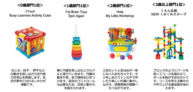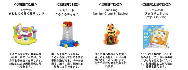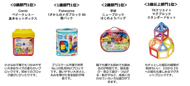 「ベストトイアワード(R)」は、トイサブ!が取り扱う全1,800種類以上のおもちゃの中から、ユーザーの評価が高かった知育玩具・おもちゃを選出し、各年齢別(0歳、1歳、2歳、3歳以上)に表彰するアワードです。第2回目となる今回は、近年幼児教育でも注目されている「非認知能力」の中から「論理的思考力」「集中力」「創造力」「コミュニケーション能力」の4つ能力を育むのに効果が期待できるおもちゃを、2022年9月30日までのデータを基に選出しました。