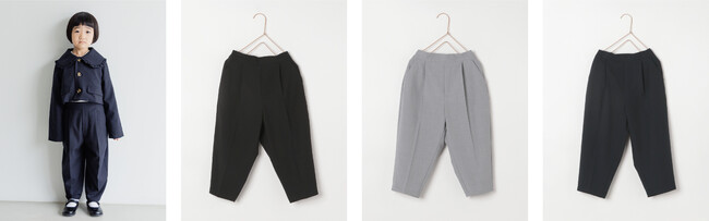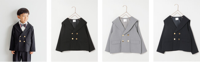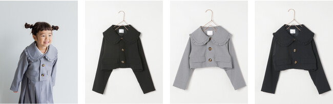 新しい旅立ちを迎える子どもたちのとっておきの瞬間を、可愛くおしゃれに彩る役に立ちたいという想いを込めたセレモニーアイテム。今回はジャケット2型、パンツ2型、ワンピース1型の計5型のラインアップ。5型とも同素材、同色で作成することで、子どもたちの好みに合わせて、自由に組み合わせを選ぶことができコーディネートを楽しんでいただけます。毎回好評のセーラージャケットは、金ボタンを使用し、トラッドムードを取り入れてアップグレードしました。新作のフリルジャケットは大きな襟とコンパクトな着丈が可愛い、1枚でコーディネートが決まる映えジャケットです。ジャケットとセットアップで着用できるショートパンツとテーパードパンツは、センタープレスが利いていてきちんと感がありつつも、ゆとりのあるシルエットでお茶目に仕上げました。ワンピースはプリーツを施したジャンパースカートのデザインで真面目さと可愛さのバランスを楽しむことができます。