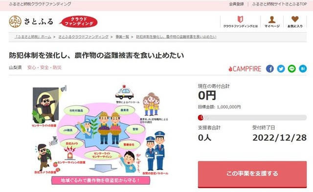 山梨県は全国有数の果物や野菜などの産地として知られていますが、近年県内の畑から大量の農作物が盗まれる被害が多数発生しています。モモの被害が特に大きく、農業者が丹精を込めて育ててきたモモが畑から一晩で全て盗まれることもありました。そこで、山梨県は農作物の盗難を未然に防止し、農業者が安心して生産に取り組める環境を整備するため寄付を募集します。寄付金は、収穫期の夜間防犯パトロールの強化や防犯機器購入の補助金として活用されます。