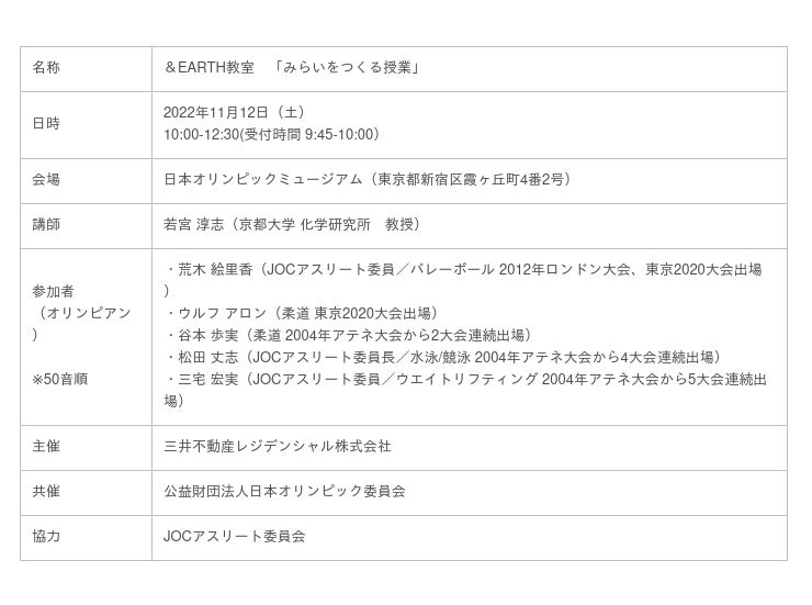 三井不動産レジデンシャル株式会社(本社:東京都中央区 代表取締役社長:嘉村 徹)は&EARTH教室※1 「みらいをつくる授業」を2022年11月12日(土)に日本オリンピックミュージアムで開催いたしますのでお知らせいたします。