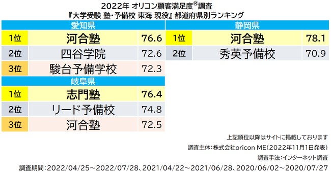 《調査概要》 2022年 オリコン顧客満足度(R)調査 大学受験 塾・予備校 現役(首都圏/東海/近畿)