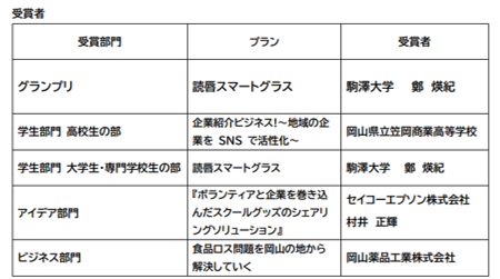 受賞者及び、応募プランの実現を後押しできるよう支援を検討、協議の上、岡山県の課題解決と地域活性に貢献できるよう継続的に情報共有をおこなっていきます。