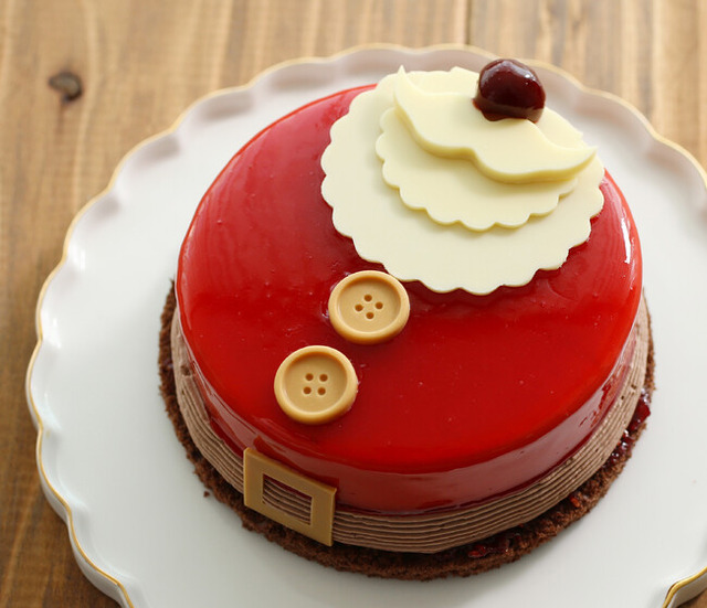 真っ赤なフランボワーズグラサージュの内側は、ほんのりキャラメル風味のショコラムース。バニラのような甘い香りのスパイス「トンカ豆」の風味をとじ込めたまろやかな口どけのブリュレと、キリッとした酸味のフランボワーズのジュレを包みました。サンタのベルトの金具やボタン、おひげは全てチョコレート、赤いお鼻はキルシュ漬けのグリオットチェリーを飾りました。 細部まで丁寧な手仕事でお届けいたします。様々な香りが織りなす豊かな味わいをお楽しみください。