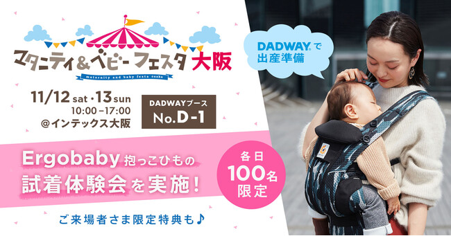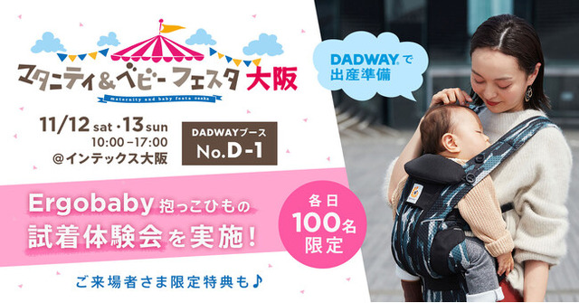 “DADWAYで出産準備”をテーマに、Ergobaby(エルゴベビー)の抱っこひもや、NUK(ヌーク)のおしゃぶりやほ乳びん、BEABA(ベアバ)の離乳食メーカーなど選りすぐりのアイテムをご案内いたします。横浜で開催の「マタニティ&ベビーフェスタ」で毎年ご好評いただいているErgobaby抱っこひもの試着体験会を各日100名限定で実施。ライフスタイルに合わせた抱っこひものご提案や、正しい着用方法をレクチャーします。