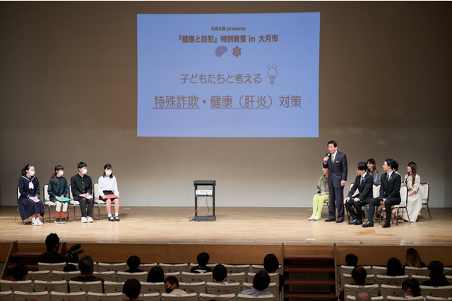 イベントでは、大月市の小中学生を代表して2名の生徒が”健康のためにできること”をテーマに作文を発表しました。子どもたちからは、「日頃の生活習慣が大切であること・定期的に検査を受けること・心と体の健康のバランスを大事にすること・食生活に気を付けること」など、健康づくりのために様々な提案を発表してもらいました。発表を聞いた杉氏は「健康についてよく調べていますね。スペシャルサポーターにしたいくらい説得力のある内容の作文で、今日一番感動しました。」と大絶賛しました。