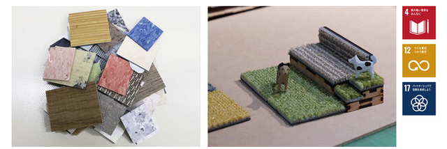 当社は、環境負荷低減の取り組みとして2021年3月に「sangetsu 見本帳リサイクルセンター」を開設し、当社の使用済み見本帳の回収・解体・分別を行っています。解体作業により発生した壁紙・床材・カーテンなどのサンプルチップは、素材ごとに分別しマテリアルリサイクルへの資源循環を進めていますが、本取り組みにより、その一部が「AkeruE」でのイベントやワークショップに活用されることで、子どもたちの新たなひらめきを育む素材として再利用されます。