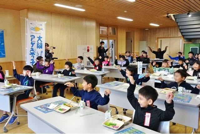 学校給食がない大間町では、食育の機会が乏しく、子どもたちの魚離れ、海離れが進んでいることが課題になっています。そこで、昼食時間に実行委員会公式キャラクターの”アゲごんべ”姿で学校へ訪問し、魚が苦手な子どもでも食べやすいお弁当「海のアゲ弁(大間アゲ魚っ子弁当)」を全校児童・教職員のみなさんへ提供。オリジナル動画を視聴してもらいながら、大間の海や漁業の特徴、海の問題を、楽しく食べて学びました。