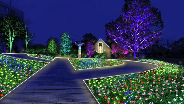 会場は木道を中心に4つのエリア(春・夏・秋・冬)の季節ごとに色分けして樹木をライトアップ