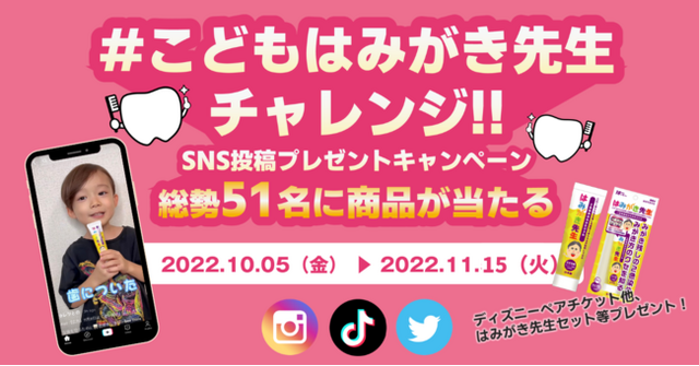 キャンペーンページに記載された「正しいはみがきの台本」の中から一つを選んで「#こどもはみがき先生」をつけてTiktok・instagram・Twitter動画投稿して頂くキャンペーンです。