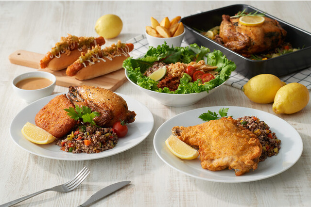 専用オーブンでじっくり焼き上げた平飼いロティサリーチキンのハーフサイズに、100%植物由来でできたフライドチキンを乗せた、ボリューム満点のメニュー。付け合わせには雑穀米が添えました。