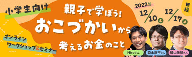 本セミナーは、「おこづかい」をテーマに1時間半の開催を予定しており、前後半にわけて親子参加型ワークショップと親向けセミナーを行います。前半は、株式会社イノビオットが運営する子ども向けオンラインスクール「みらいいアカデミア」代表講師のHiro氏(12月10日)および株式会社マネネ代表取締役社長の森永 康平氏(12月17日)による親子で参加できるワークショップを実施します。それぞれ「おこづかい」に関するゲームやクイズを行い、日常的に家族でお金について会話ができるようなきっかけやアイディアをお届けします。後半は両日共、6人のお子様を持ち、ご自身も「マネー家族会議」をご家庭で実施している、家計再生コンサルタント・ファイナンシャルプランナーで、株式会社マイエフピー代表の横山 光昭氏に、「おこづかい」のあげ方や見守り方、そこから見える家計の見直し術など、大人の方向けのセミナーを実施いただきます。