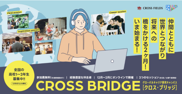 NPO法人クロスフィールズ(東京都品川区、代表:小沼大地)は、2022年12月より国際的な社会課題を探究し、将来のキャリアや進路について考える全国の高校生向けキャリア教育プログラム「グローバルキャリア探究キャンパス “CROSS BRIDGE”(クロス・ブリッジ)」を開講。11/8(火)から12/5(月)12:00までの期間で参加者を募集します。それに伴い、11/24 (木) 19:00より本プログラム開講の背景や若年層が社会課題の現場に越境する価値について、東明館学園の神野校長・トビタテ留学JAPANの西川朋子氏と語り合うキックオフイベントを開催します。 (本事業は 経済産業省 令和4年度「未来の教室」実証事業 (テーマE 「多様な個性・才能・創造性を開花させ育むサードプレイス」の採択事業者として実施します)