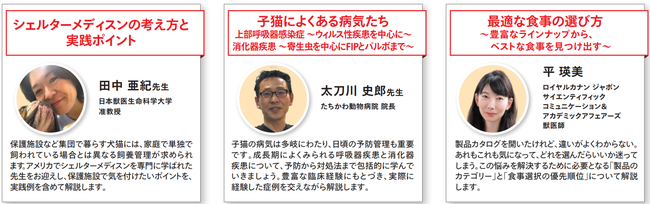 「PROFESSIONAL SEMINAR」は、ブリーダー・シェルター・訓練所等の犬と猫の専門家の皆さまと共に、犬と猫を取り巻く環境の向上とビジネスの持続的な発展を目的として、ロイヤルカナンが提供している学術セミナーです。犬と猫の栄養学、繁殖学、行動学、衛生管理などをテーマに大学教授や獣医師などによる講演を、専門家の皆さまとの知識の共有の場として開催しています。今回の「PROFESSIONAL SEMINAR in 2022」では、シェルターという特殊な環境で暮らす犬と猫の健康を守るため、シェルターメディスンおよび子猫の感染症をテーマに、犬と猫の健康やビジネスに役立つ学術知識を提供します。