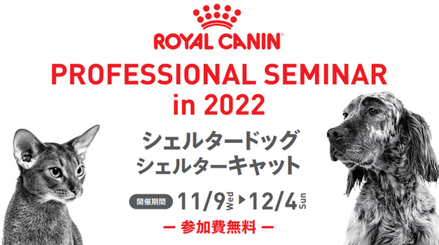 栄養学に基づいて犬と猫の健康を実現する企業として、プレミアムペットフードおよび食事療法食を展開するロイヤルカナン ジャポン(本社:東京都港区、社長:山本 俊之)は、本日2022年11月9日(水)から12月4日(日)まで、ブリーダー・シェルター・訓練所等、犬と猫の専門家に向けたオンライン学術セミナー「PROFESSIONAL SEMINAR in 2022」を開催します。