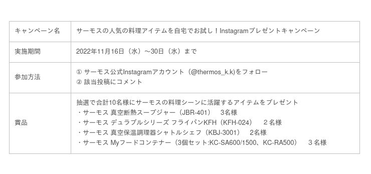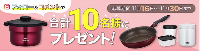サーモスの料理シーンに活躍するアイテムが、抽選で合計10名様に当たる「サーモスの人気の料理アイテムを自宅でお試し!Instagramプレゼントキャンペーン」を11月16日(水)~11月30日(水)までサーモス公式Instagramアカウントで実施します。