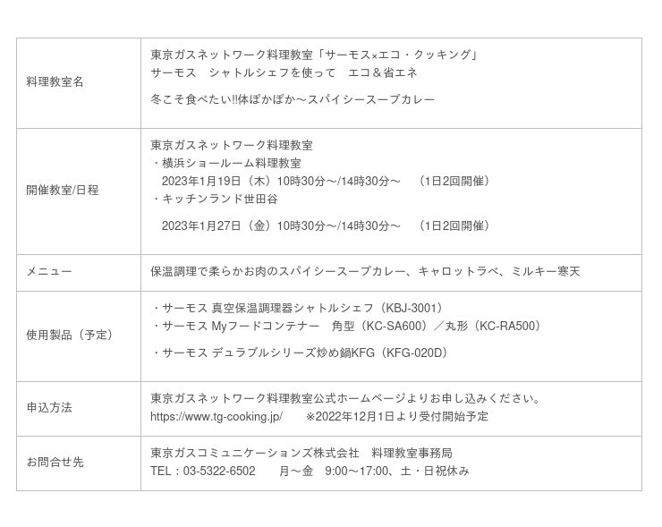 『東京ガスネットワーク料理教室「サーモス×エコ・クッキング」サーモス シャトルシェフを使って エコ&省エネ 冬こそ食べたい!!体ぽかぽか~スパイシースープカレー』を2023年1月に開催します。東京ガスネットワーク料理教室では、2018年よりサーモス製品を使用した料理教室を実施し、多くのお客様にご参加いただいております。