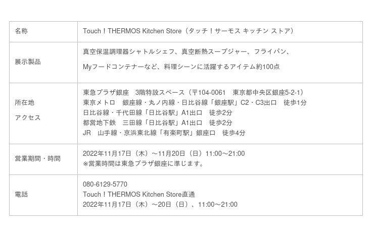 魔法びんのグローバル企業として、人と社会に快適で環境にもやさしいライフスタイルを提案するサーモス株式会社(本社:東京都港区 社長:片岡有二)は、調理器具などの料理シーンに活躍するアイテムが150点を突破したことを記念して、サーモス初のショールーミングストア「Touch!THERMOS KITCHEN STORE(タッチ!サーモス キッチン ストア)」(https://www.thermos.jp/info/event/kitchenstore2022/index.html)を、東急プラザ銀座(東京都中央区銀座5-2-1 3階特設スペース)に11月17日(木)~20日(日)までの期間限定でオープンします。
