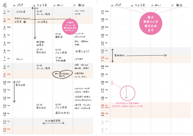 今までの手帳では、家族のスケジュールがパパッと見られない、書けない。そんな悩みが解消します!家族のスケジュールがパッと見開きで1か月分把握できる、ファミリーマンスリーページ。毎日の夕食の献立も書き込めます。日付をまたぐ線が引きやすいドット入り。シングルの方も仕事とプライベートで区分けして書き込めるので、ご自身に合わせてご使用いただけます。