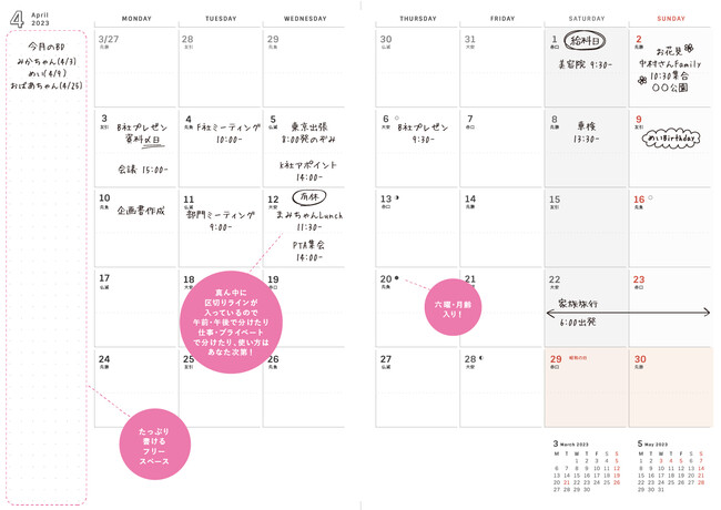 マンスリーページは、忙しくても簡単に、楽に管理できるように、シンプルなページ構成。上下段で点線を入れてあるので、午前・午後で分けたり、自分と家族のスケジュールで分けたり、人それぞれ自由に使い分けができます。自由度の高い方眼ドットのフリースペースがあります。予定を組むのに便利な六曜・月齢も入れてあります。