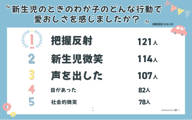 子どもの行動で愛おしさを感じたとき「把握反射」が一番多く、次いで「新生児微笑」、「声を出した」と続きました。