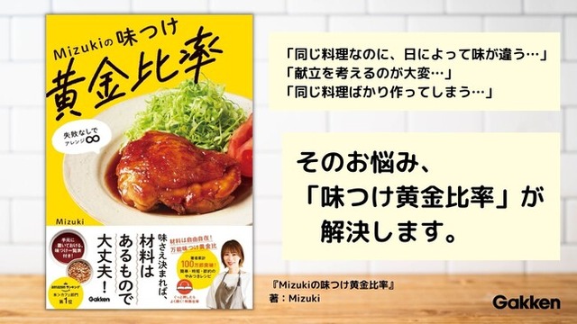 株式会社学研ホールディングス(東京・品川/代表取締役社長:宮原博昭)のグループ会社、株式会社Gakken(東京・品川/代表取締役社長:五郎丸徹)は、2022年11月10日(木)に『Mizukiの味つけ黄金比率』(著:Mizuki)を発売しました。