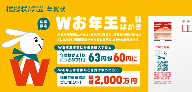 Wお年玉年賀はがきは、お客様とのご縁を深めたいという想いから、年賀はがき代金のうち3円を挨拶状ドットコムが負担し、1枚につき60円で販売しています。