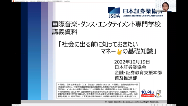 金融リテラシーセミナーでは在校生の金融に対する意識を向上させることを目的に、日本証券業協会金融・証券インストラクターの高木様より、「社会に出る前に知っておきたいマネーの基礎知識」というテーマでご講演頂きました。