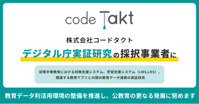株式会社コードタクト(本社:東京都渋谷区、代表取締役:後藤 正樹、以下当社)は、2022年10月25日、デジタル庁の「初等中等教育における校務支援システム、学習支援システム(LMS,LRS)、関連する教育アプリとの間の教育データ連携の実証研究に参加する事業者の公募」に採択されました。本実証研究事業では、国際標準の仕様に合わせて教育データを利活用できる基盤を実装していきます。