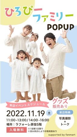『ひろぴーファミリー』は「 育児は楽しい!」をコンセプトに家族の日常を発信している、SNS総フォロワー数78万人突破の大人気ファミリーインフルエンサーです。名古屋市でイベント開催した際には、1日で750名以上の集客をしています。この度、待望のオリジナルファングッズ販売と一緒に、会えるポップアップイベントを開催いたします。