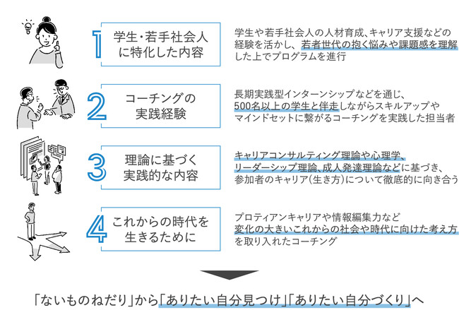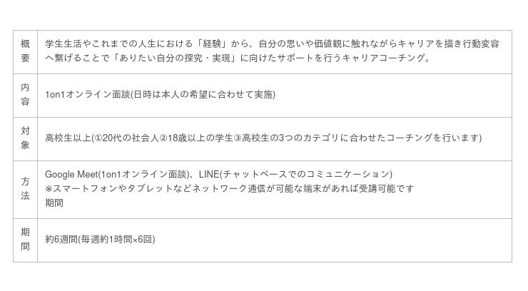 学生生活やこれまでの人生における「経験」から自分の思いや価値観に触れながら、これからのキャリア(生き方)を描き行動変容へ繋げる学生・若手社会人特化型パーソナルキャリアコーチングを実施。