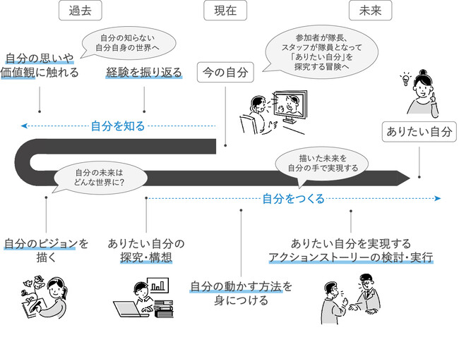 本プログラムは、参加者自身の過去・現在・未来にフォーカスし、キャリアコンサルティング理論・コーチング理論・リーダーシップ理論などを組み合わせながら「ありたい自分の探究・実現」に向けたサポートを行います。